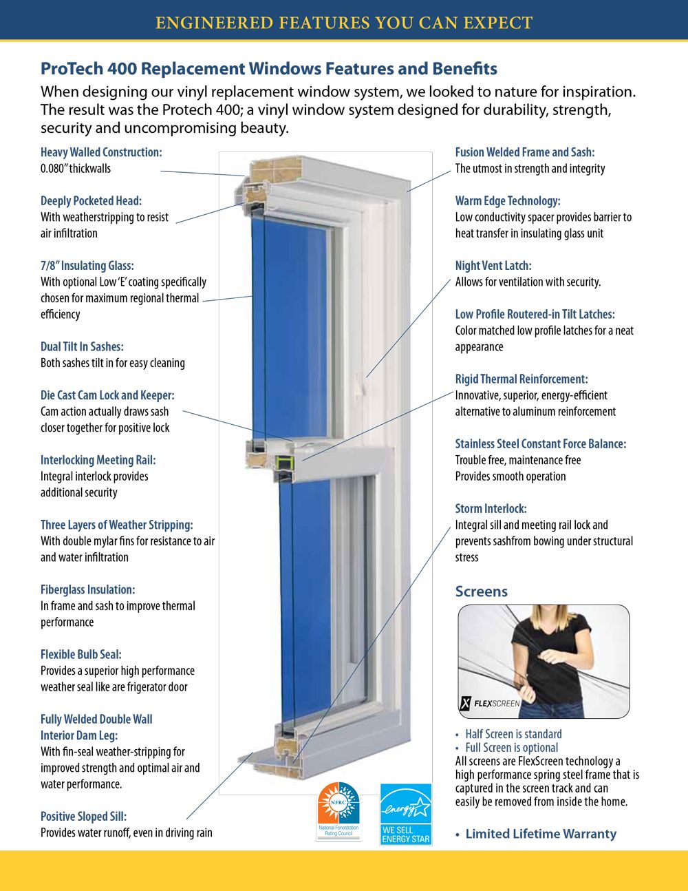 State of the Art Technology More than thirty years of research and development are built into every fully welded Pro-Tech 400 Series replacement window, producing state of-the-art designs using advanced production techniques. A technologically advanced fabrication process allows compound shapes to be fusion welded at sill corners, producing a window that is actually stronger than conventional welded windows. Innovative technology means unparalleled styling and top performance for homes of distinction.
